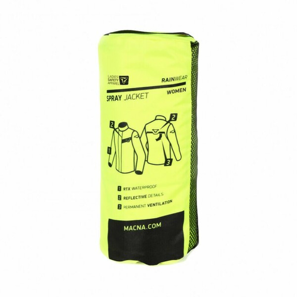 Macna Spray este o geaca de ploaie special confectionta pentru silueta feminina, cu insertii reflectorizante, disponibila in culoarea neagra sau galben fluorescent. Este fabricata dintr-un material impermeabil, similar membranelor folosite in gecile superioare de la producatorul olandez. Un material foarte usor care odata adunat, ocupa un spatiu foarte redus si astfel poate fi luat oriunde si oricand in calatoriile tale. Este bine de stiut faptul ca aceasta jacheta se poate utiliza si in alte activitati outdoor precum, pescuit, drumetii, vanatoare si alte activitati externe, pe langa utilizarea specifica motocicletelor, atv-urilor sau scuterelor. Materialul rezistent si cusaturile laminate asigura rezistenta produsului la viteze mari dar si confortul termic atunci cand calatoria ta traverseaza zone cu temperaturi scazute.