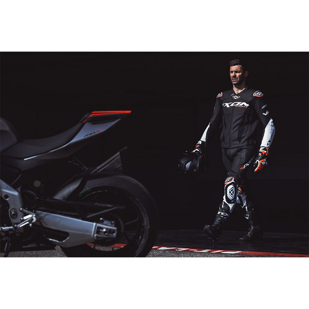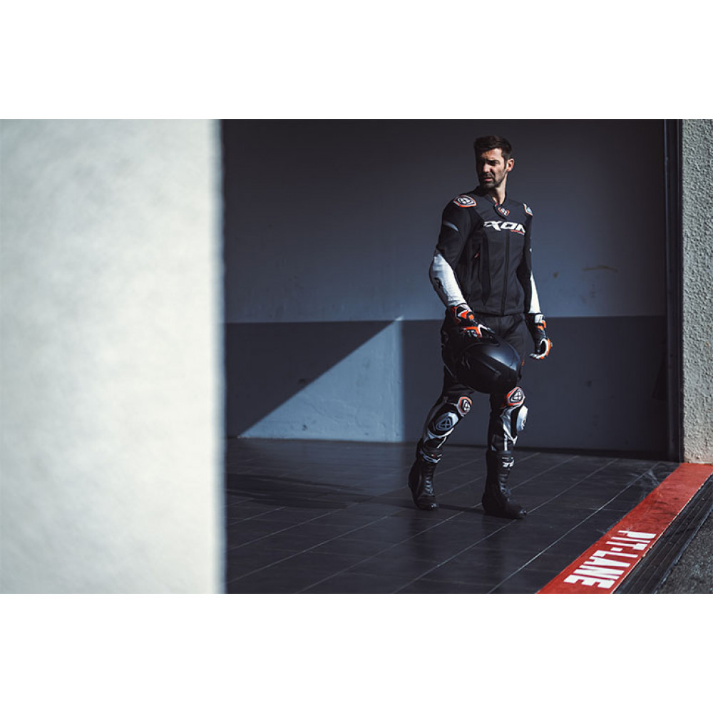 • slidere de genunchi RACE 2.0, detasabile (removable), inlocuibile (replaceable) si ajustabile (adjustable) - aceleasi slidere montate pe costumele pilotilor Ixon din MotoGP;