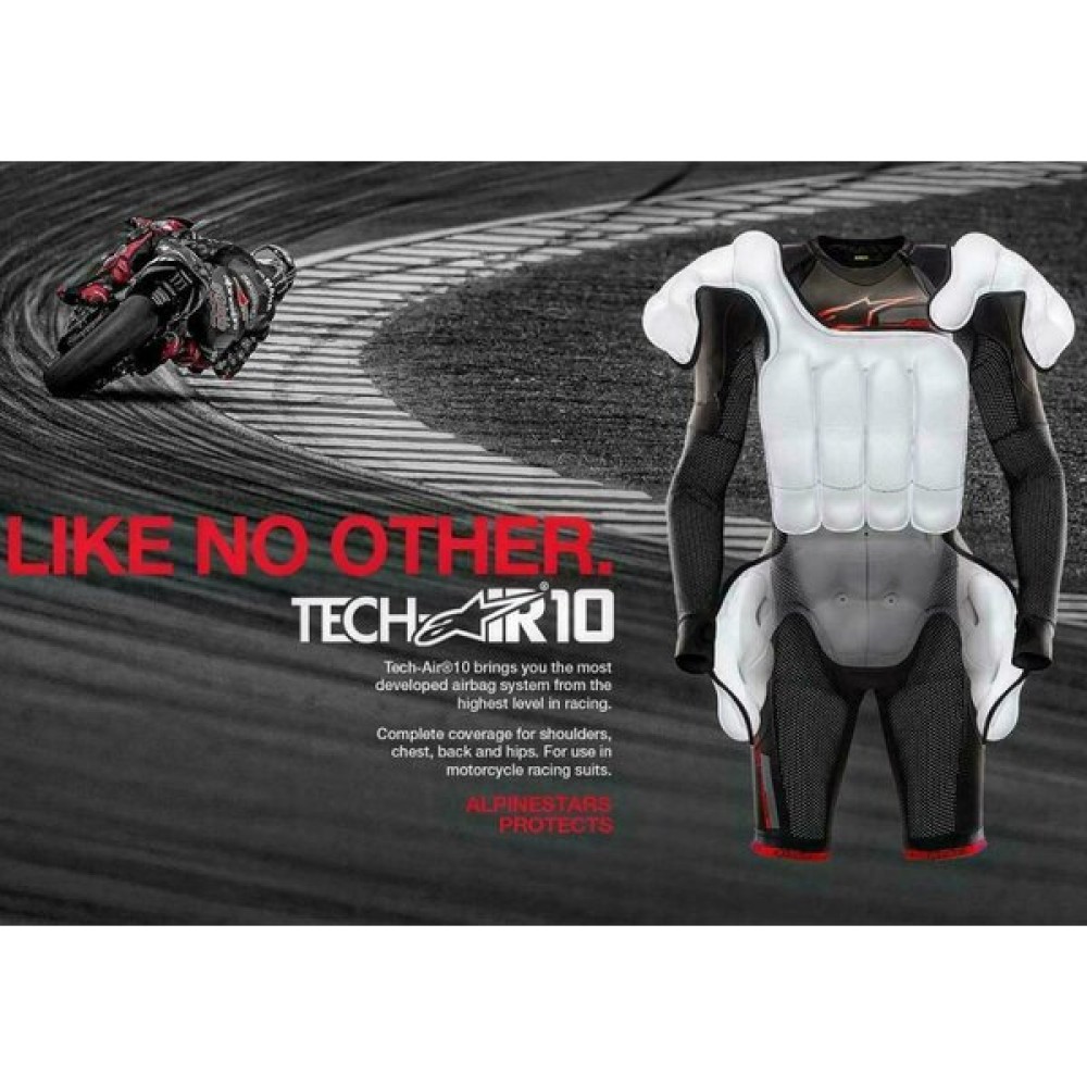 Tech-Air® 10 este cel mai recent airbag autonom inovator care se alătură familiei Tech-Air® Alpinestars, care include sistemele electronice de tip airbag Tech-Air® Race, Tech-Air® Street și Tech-Air® 5. Derivat din tehnologia airbag-ului Alpinestars adoptată de motocicliștii din MotoGP, Tech-Air® 10 este un sistem de airbag slim, autonom, care oferă protecție corporală de neegalat pilotilor de curse, pilotilor la track day și riderilor de asfalt, acoperind umerii, clavicula, pieptul, spatele complet pana la coccis cat si șoldurile pilotului.
